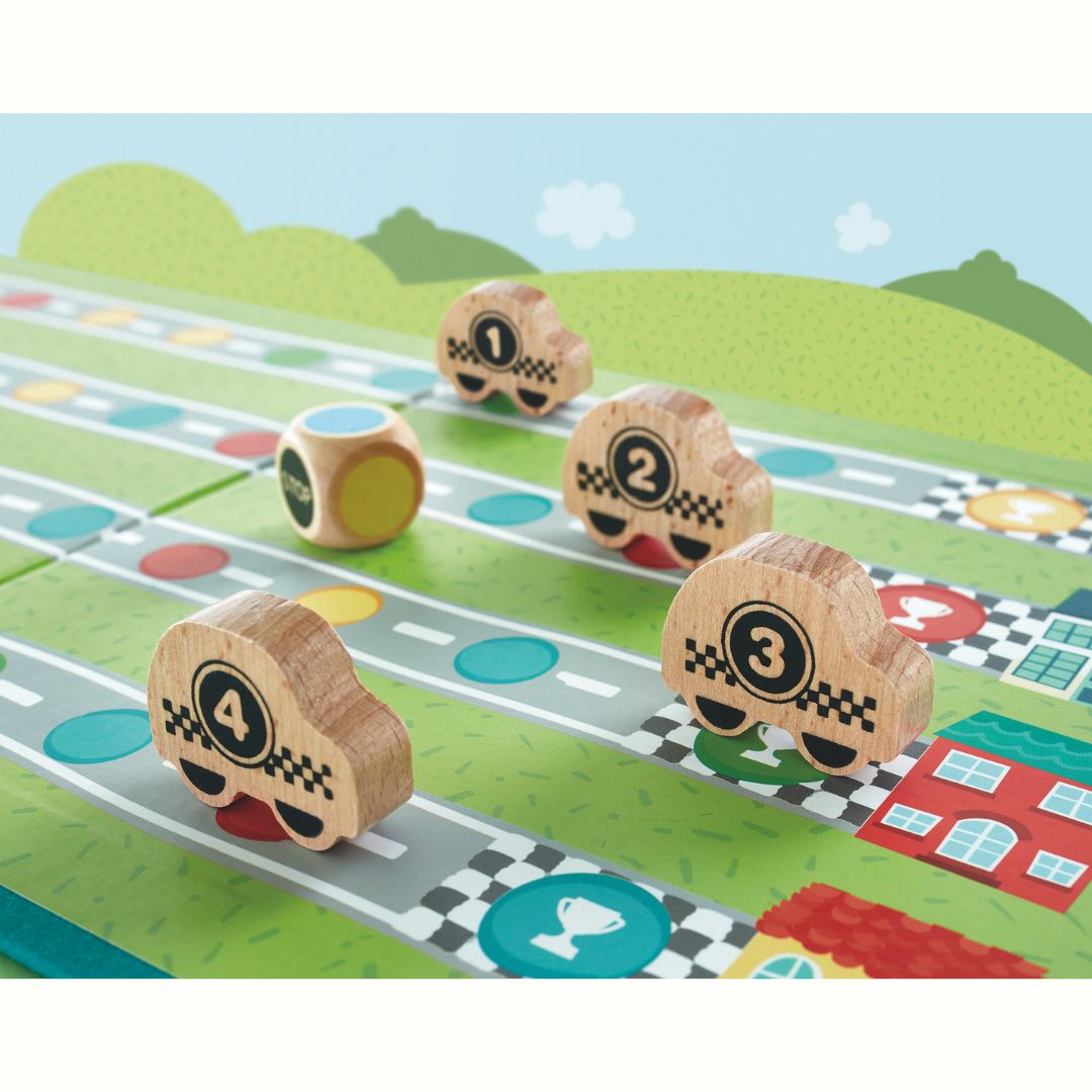 Sadrži sklopivu tablu, četiri drvena automobila i jednu kockicu u boji.