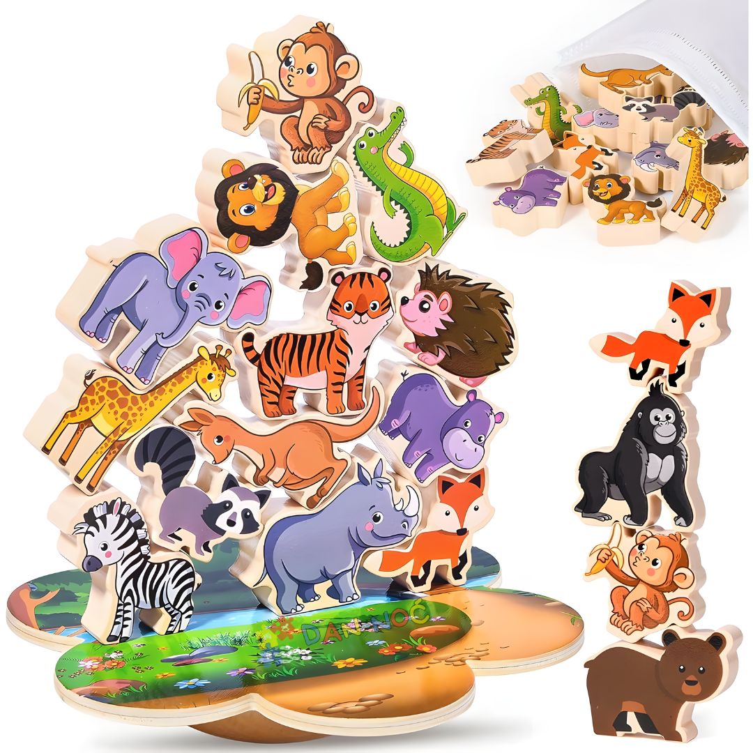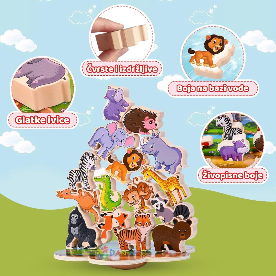 UNESITE SMEH, KREATIVNOST I BESKRAJNU ZABAVU U DEČIJU IGRU DOK MALIŠANI RAZVIJAJU KONCENTRACIJU, KOORDINACIJU I MAŠTOVITE PRIČE KROZ ŠARENI SVET DRVENIH ŽIVOTINJA.