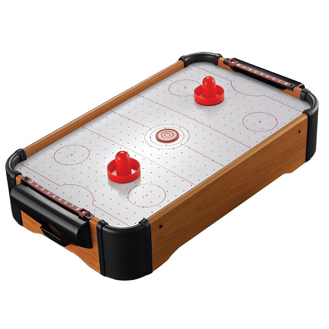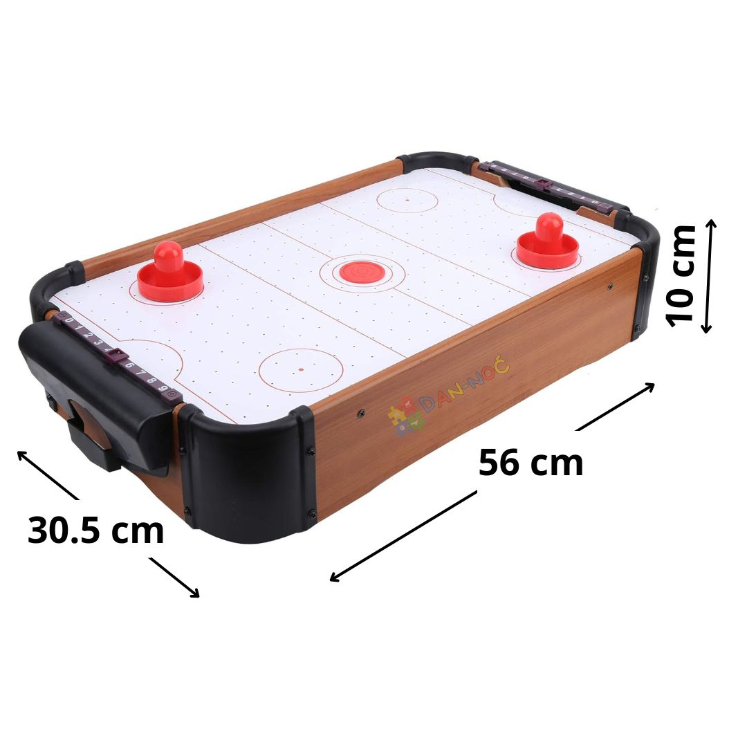 Sto je izrađen od gustog, izdržljivog drveta i plastike visokog kvaliteta, što obezbeđuje dugotrajnost i bezbednost tokom igre. Zahvaljujući posebnoj površini stola i ugrađenom ventilatoru, pak se kreće brzo i glatko, stvarajući osećaj pravog hokeja na ledu.