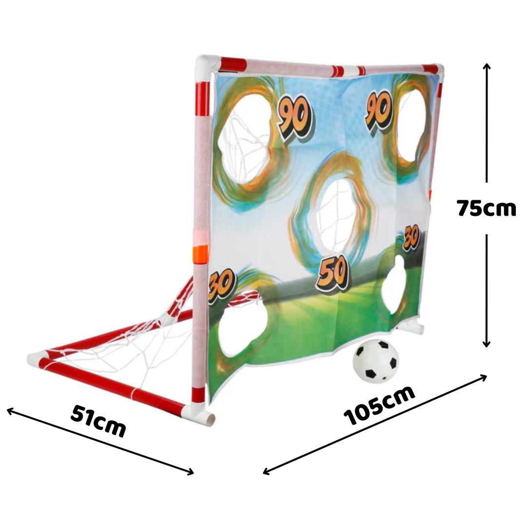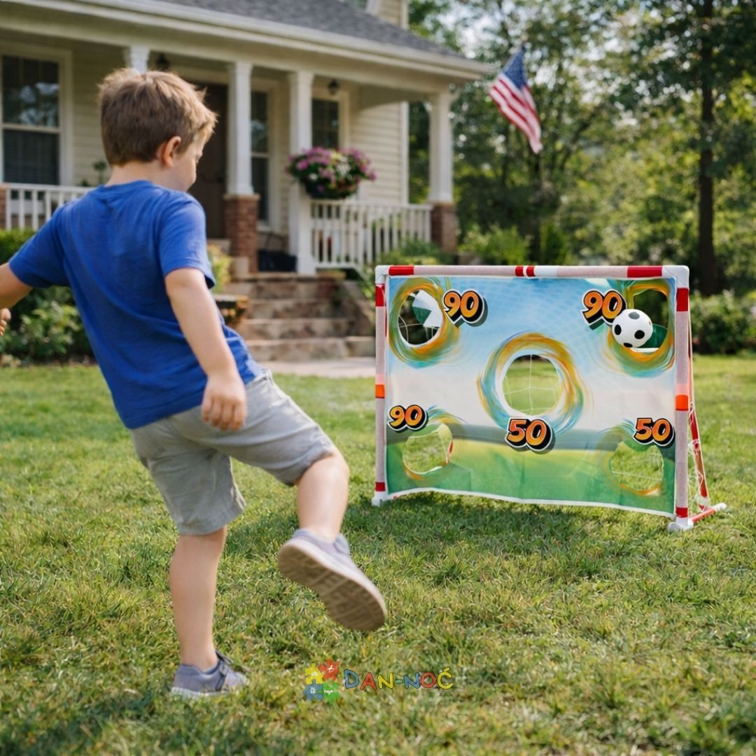 Ovaj fudbalski gol sa platnom i metama pretvara svako dvorište ili sobu u pravi mini stadion! Deca se kroz igru trude da pogode rupe označene poenima, a svaki precizan šut donosi novu radost i osećaj uspeha. Igranje postaje zabavno takmičenje koje motiviše decu da vežbaju i razvijaju sportski duh.