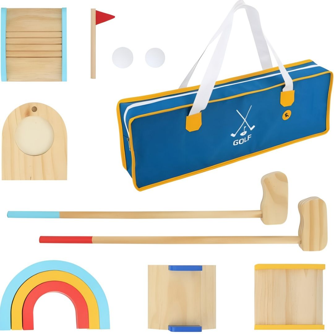 Doživite porodičnu i prijateljsku zabavu na potpuno nov način – uz igru sa drvenim setom mini golfa koji podstiče strateško razmišljanje, koordinaciju i sate smeha na svežem vazduhu!