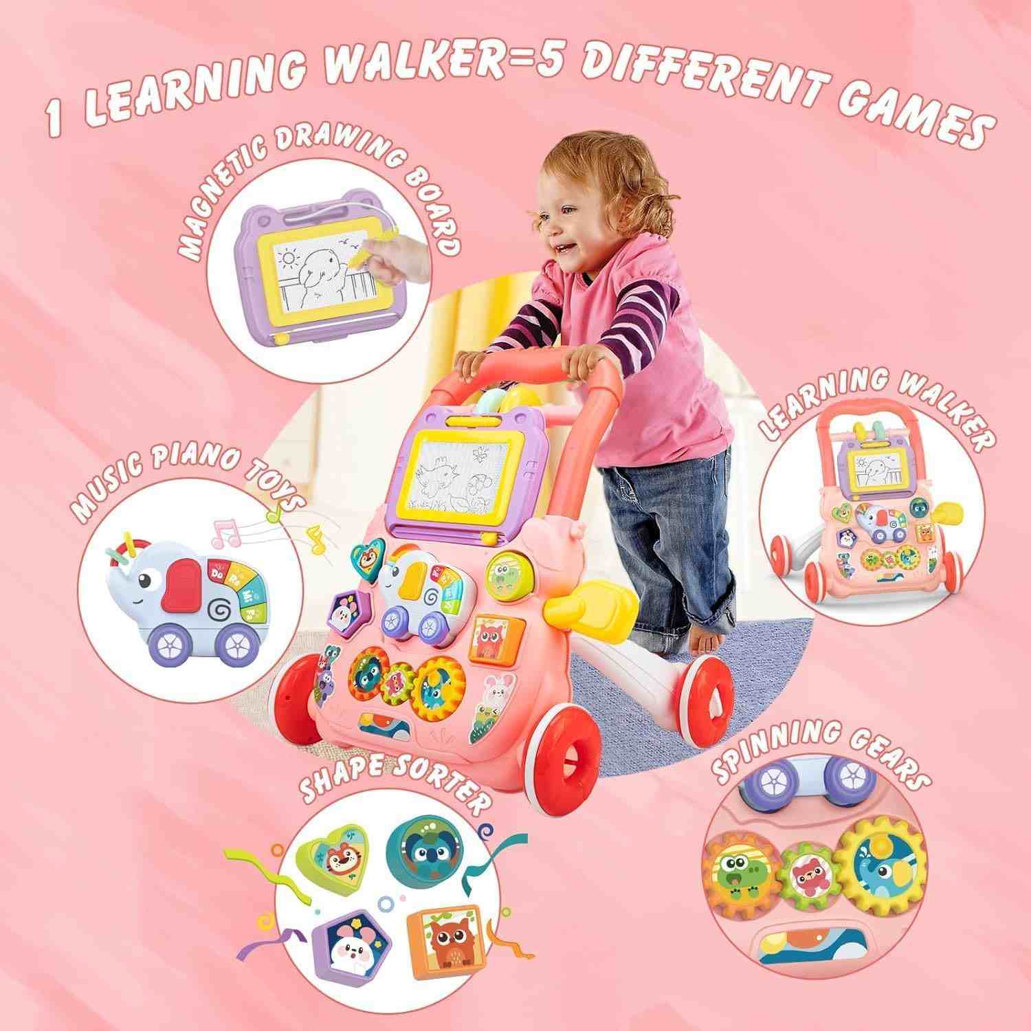 Edukativne melodije i svetlosni efekti stimulišu čula i podstiču bebu da se igra i istražuje. Svaka aktivnost u ovoj šetalici prilagođena je uzrastu deteta, pomažući mu da kroz igru razvija koordinaciju, kognitivne sposobnosti i motoriku.