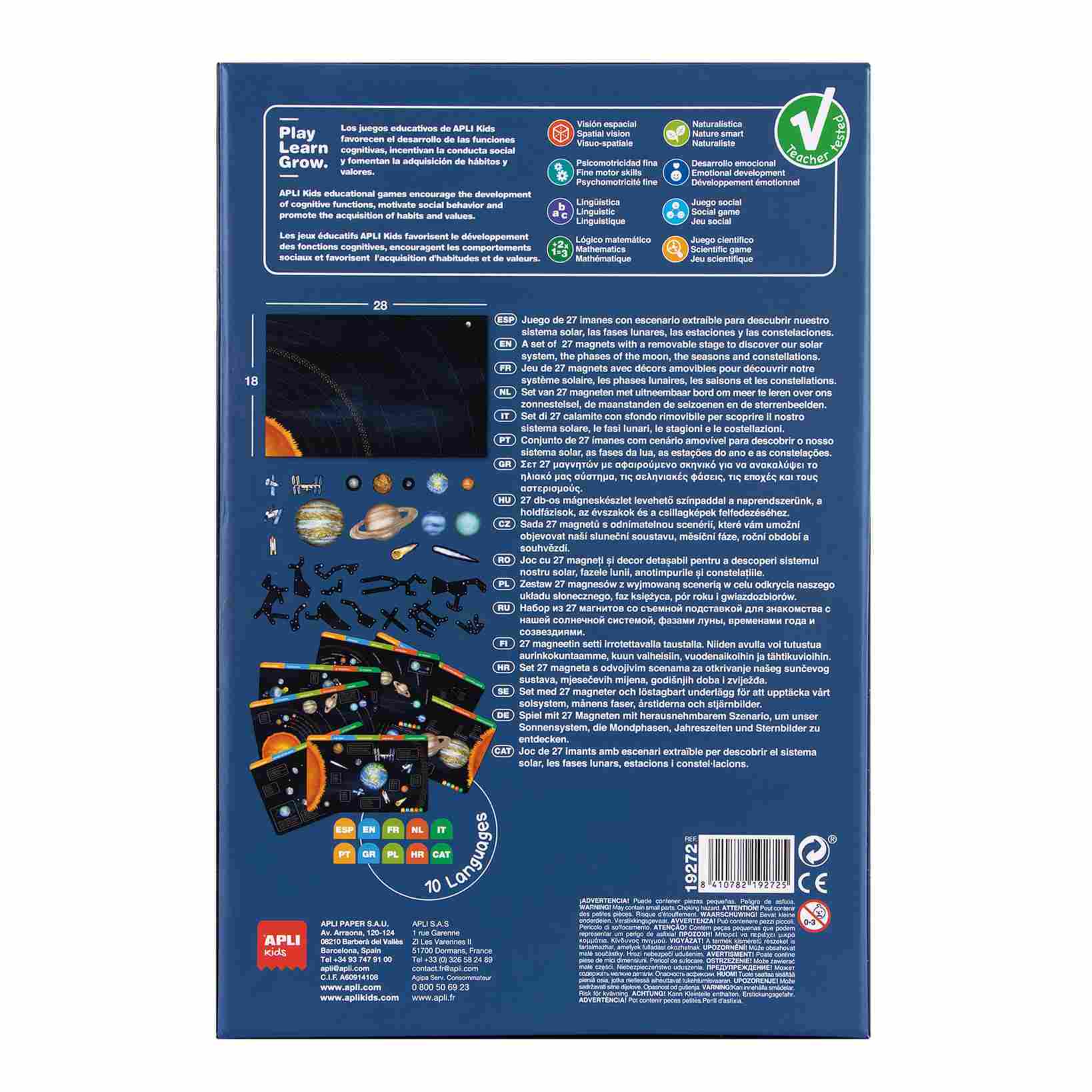 Ova magnetna igra omogućava deci da istražuju Sunčev sistem postavljanjem magneta na tablu dimenzija 28 x 18 cm. Deca se upoznaju sa planetama, mesecem, sazvežđima i fazama meseca kroz interaktivne kartice na 10 jezika.