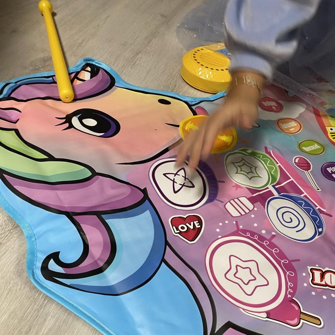 Muzička podloga za decu 2 u 1 - Jednorog stvorena je da mališanima donese radost, pokret i prve muzičke korake! Sa šarenim jednorog dizajnom, nežnim bojama i velikom površinom za igru, mali muzičar može da svira rukama, stopalima ili priloženim palicama, otkrivajući ritam i melodiju kroz igru.