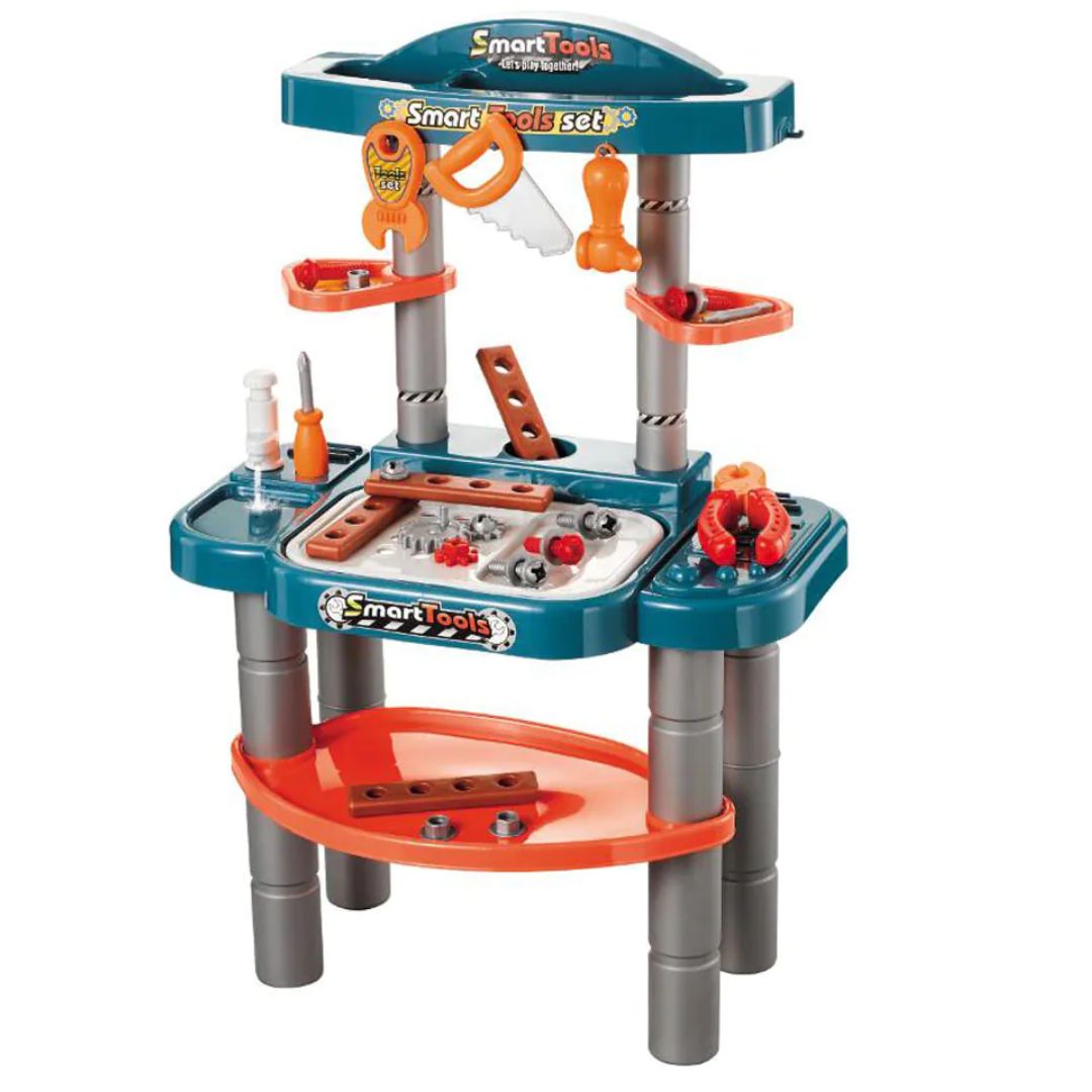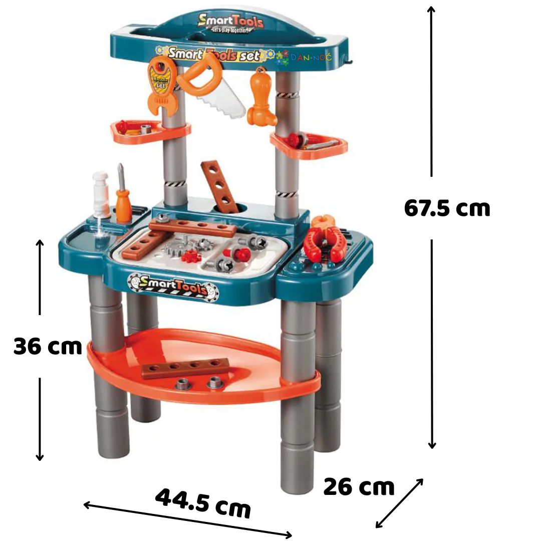 Pored radnog stola, u paketu se nalaze testera, šrafciger, klešta, čekić, ključ, šrafovi, matice i imitacije drveta za šrafljenje. Sve ima svoje mesto, što pomaže deci da razviju urednost i organizovanost.