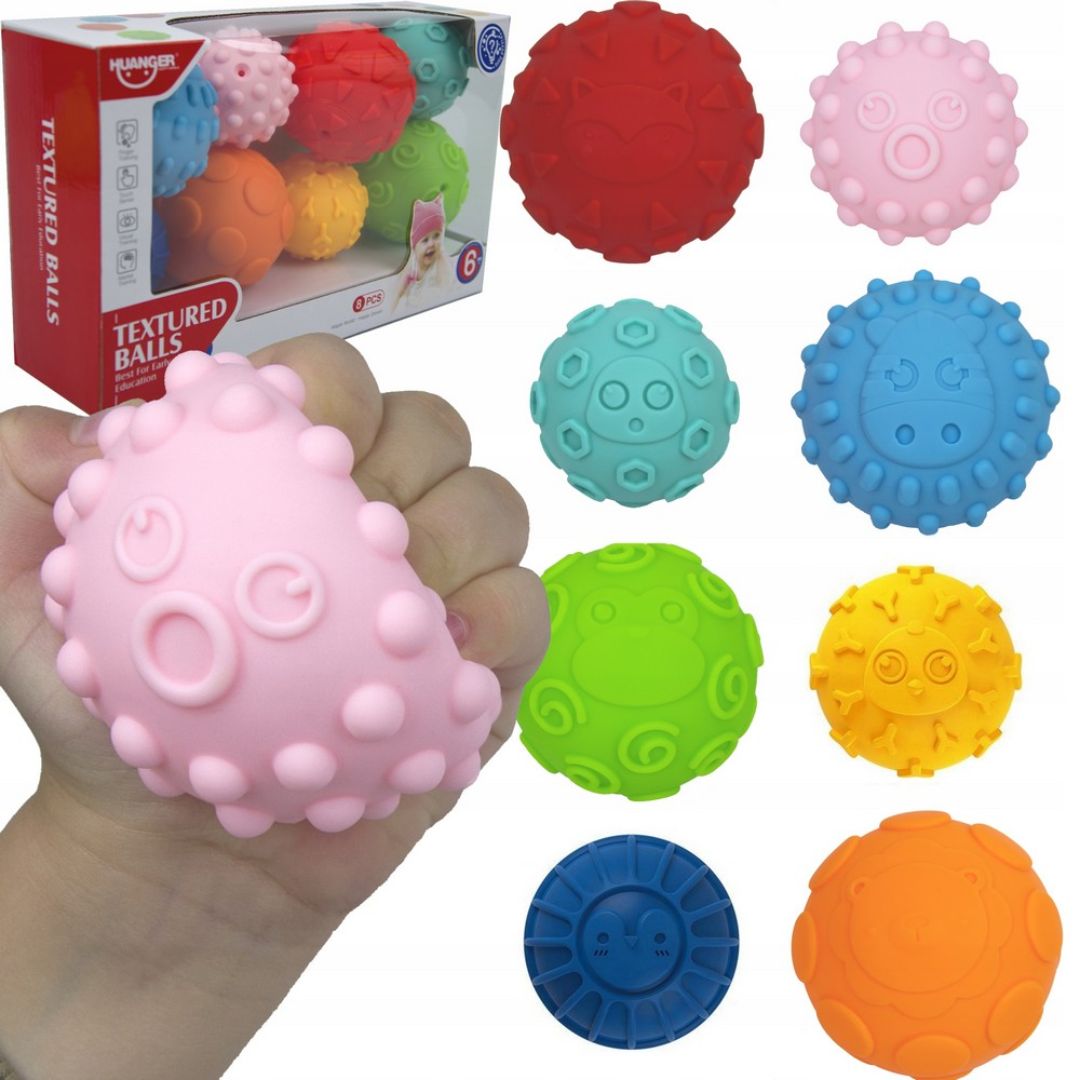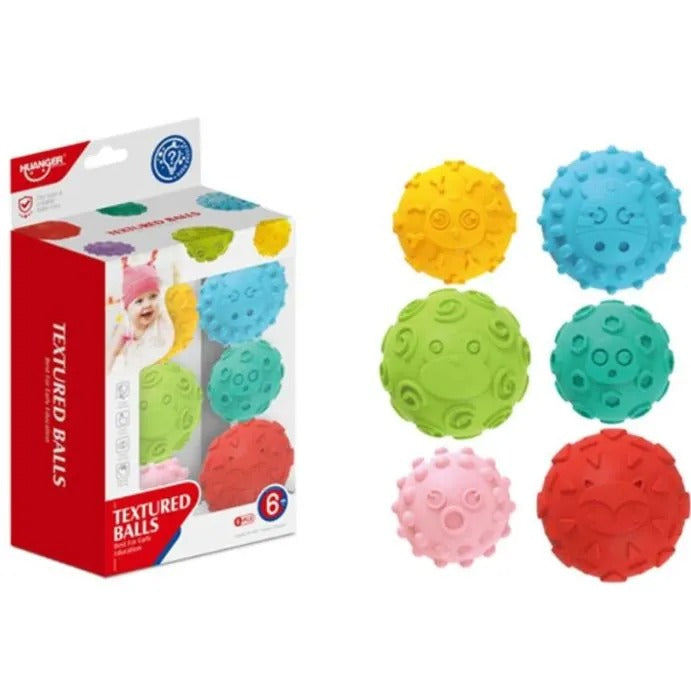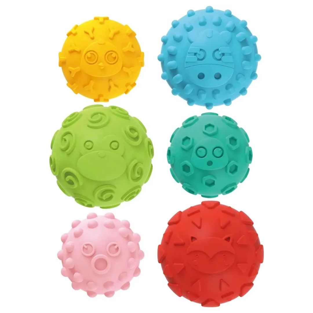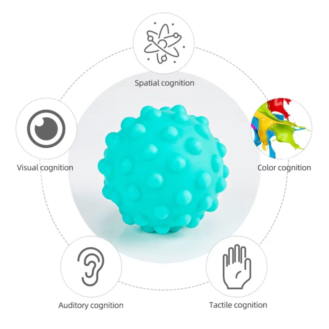 Svaka od šest loptica ima jedinstvenu teksturu, veličinu i oblik, pa dete kroz igru uči da prepoznaje različite površine, oblike i boje. Dodirivanjem, stiskanjem i bacanjem, mališani razvijaju taktilna čula i koordinaciju ruku i očiju – osnovu za sve kasnije veštine.