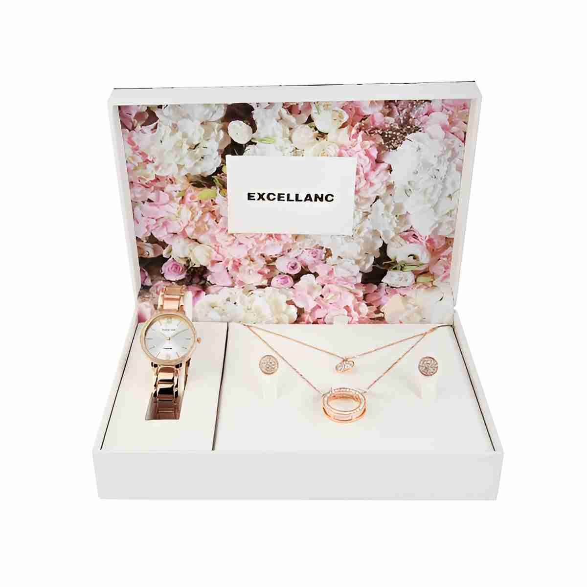 Savršen poklon za dame koje vole sofisticiranost i stil! Excellanc poklon set u nežnim roze i zlatnim tonovima sadrži elegantan sat, prelep lančić i klasične minđuše – sve što je potrebno za upečatljiv i ženstven izgled.