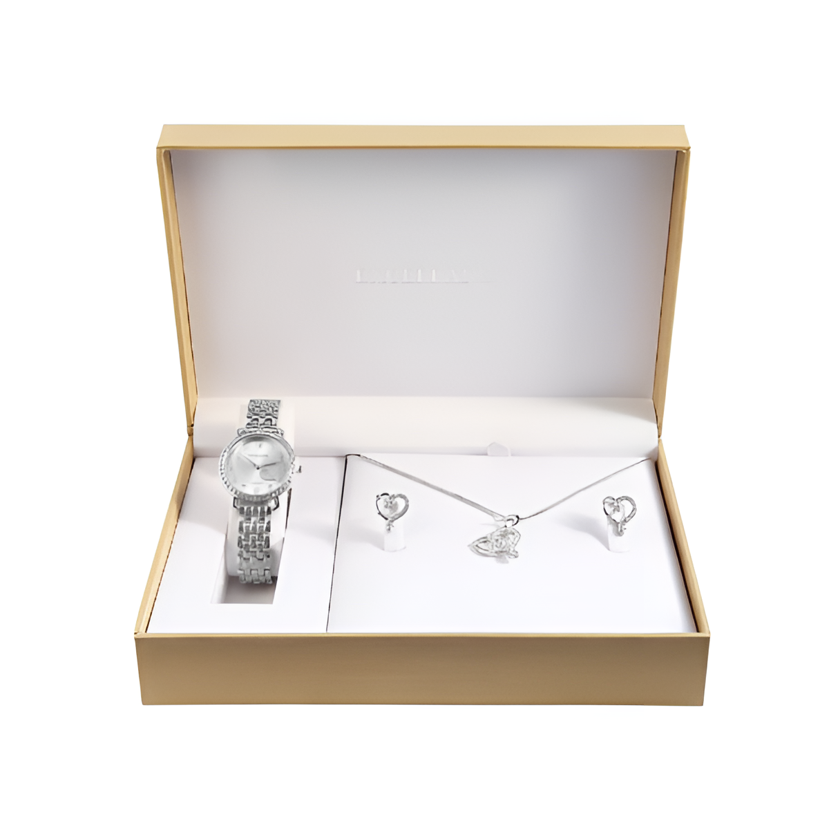Savršen poklon za dame koje vole klasičan i sofisticiran stil! Excellanc poklon set u prelepoj srebrnoj boji sadrži elegantan sat, prelep lančić i klasične minđuše – sve što je potrebno za sjajan i otmen izgled.