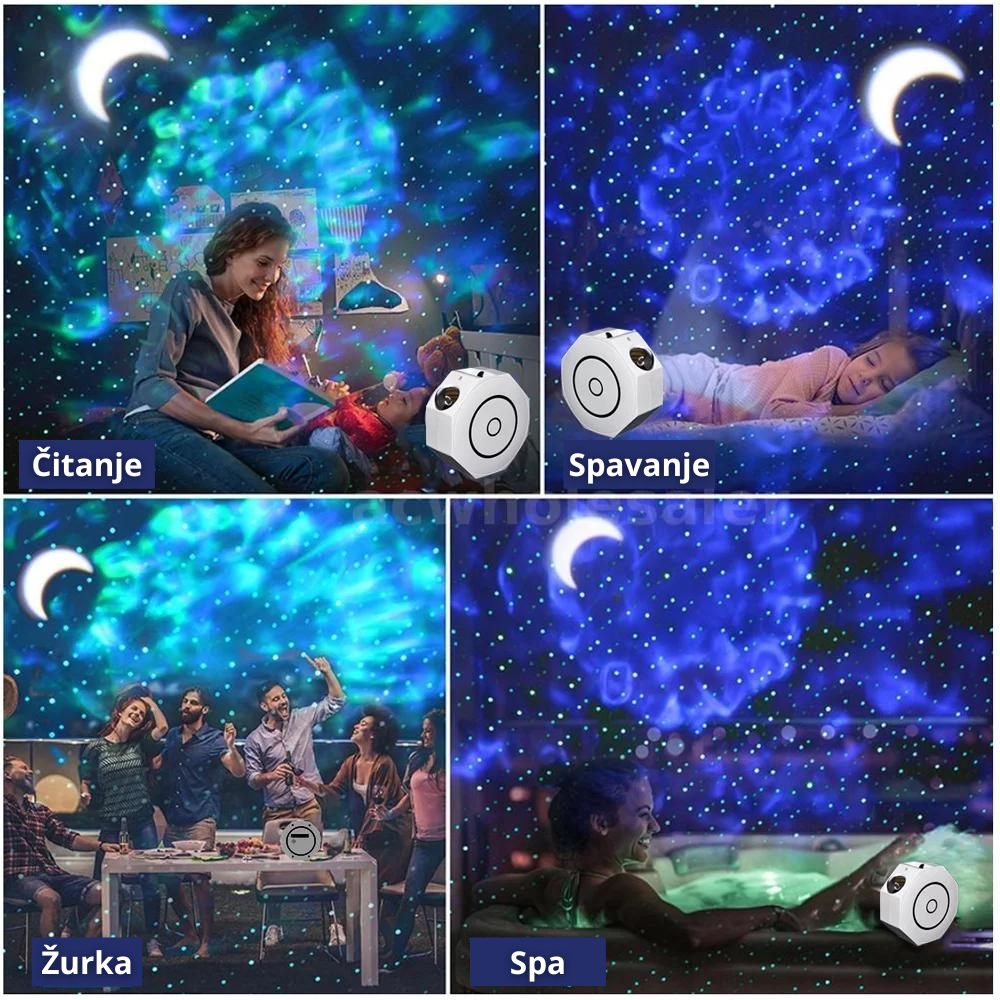 Zvezdani Projektor omogućava jednostavno upravljanje bojama putem daljinskog upravljača, dok se šablone poput meseca, sazvežđa i duge mogu rotirati pomoću točkića na samom uređaju.